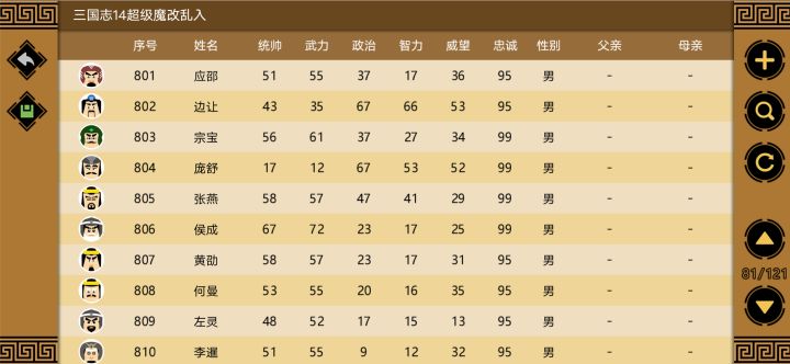 人物方面个性和属性可能存在偏差,因为是看到演义中的官职决定偏文还是偏武,炮灰路人类的属性都不太高(掺一句,曹操和孙坚这俩是真的能生);朝鲜这边是搜的朝鲜历史名人,然后延伸搜索了一下亲属关系,选择性地做了几个人物;日本这边,卑弥呼,难升米和台与是找得到出处的,大国主、建御名方和少彦名是看的骑马与砍杀三国mod里面的名字,剩下的有名字的是日本战国时期的人物。实际上人物还是不全的,演义前20回的有名字的都在里边了,后边大部分不怎么出名的就未必在了(还是因为懒