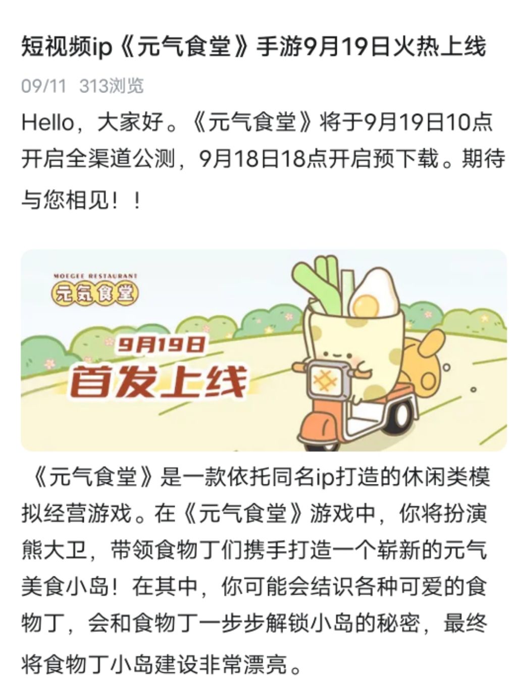 元气食堂9月19日10点,将开启全渠道公测,18日18点可以抢先预下载。