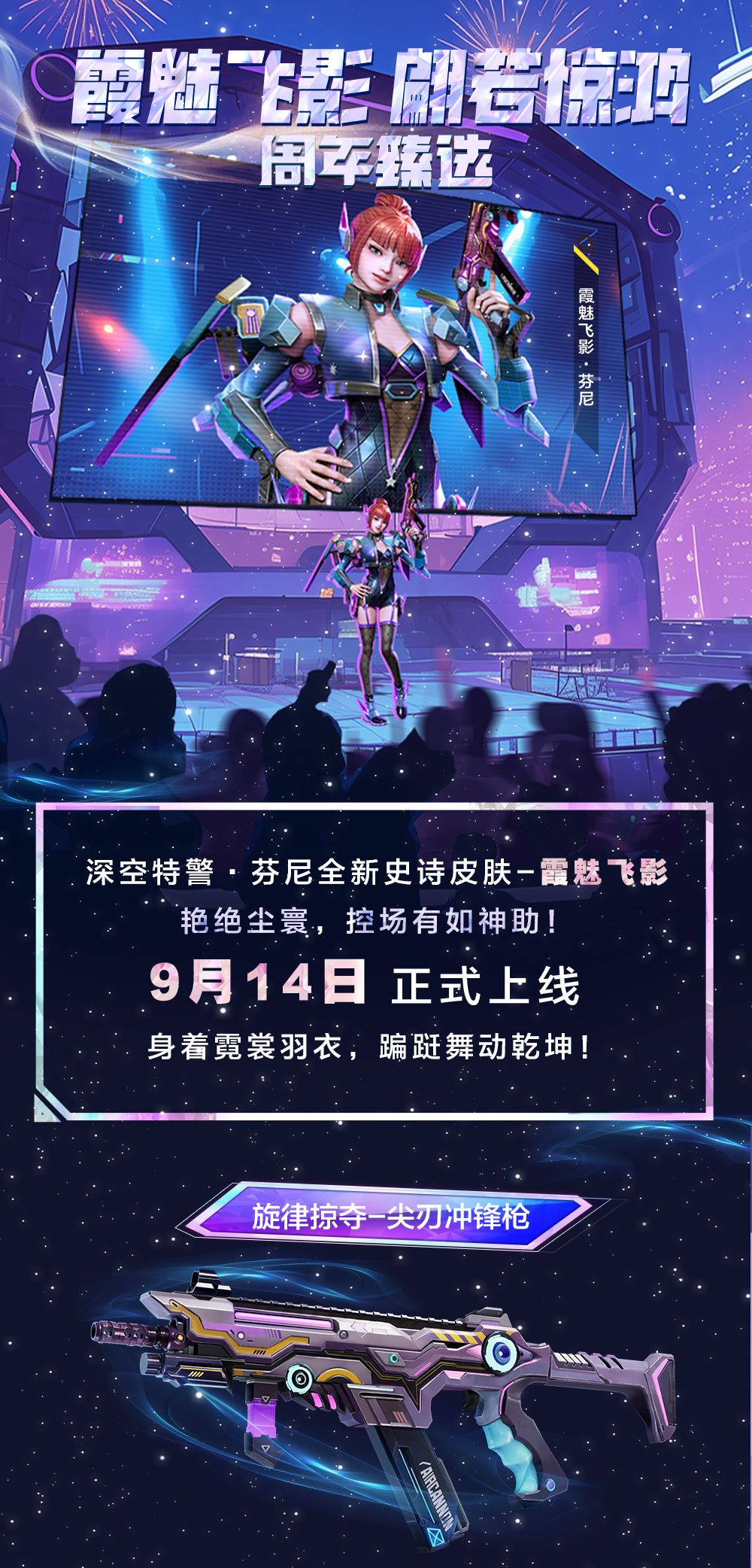 深空特警·芬尼全新史诗皮肤9月14日正式上线,“周年臻选”主题活动同步开启,尖刃冲锋枪精美武器装扮-旋律掠夺同期火热来袭!盛况当前,快来同芬尼共襄盛举!