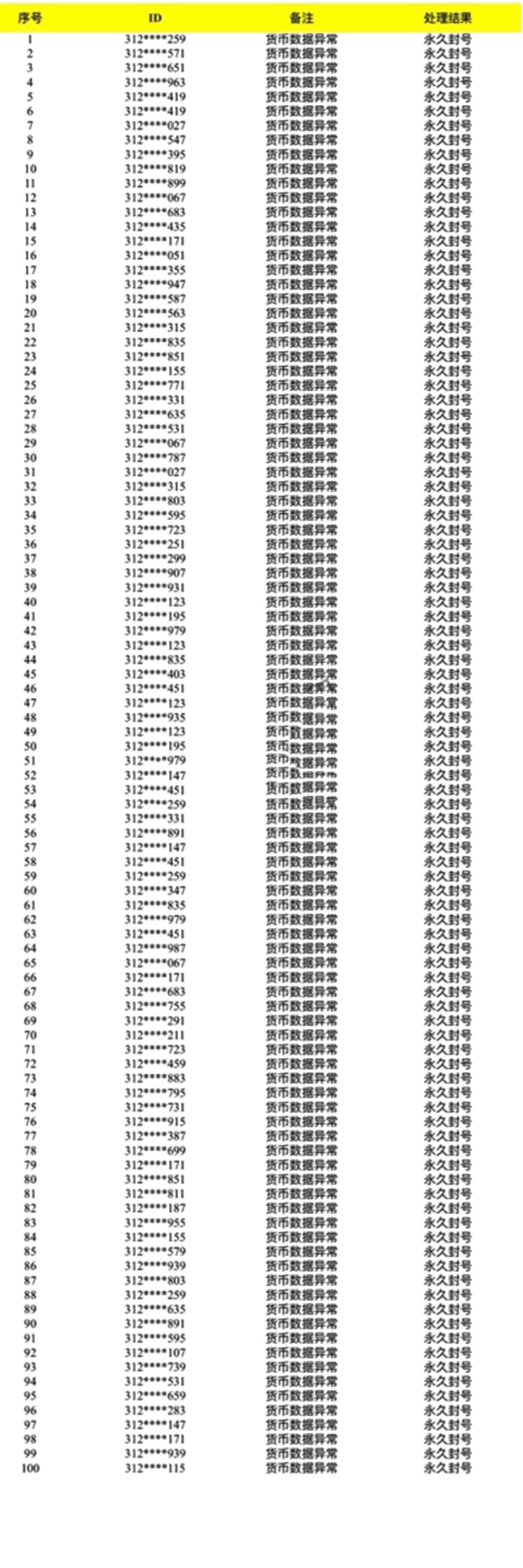 本次行动针对部分渠道账号进行核实,从严查处游戏内数据异常行为,市政工已收集了相关违规账号信息,并对这些玩家进行了永久封号处理,将于此公告中予以公示。