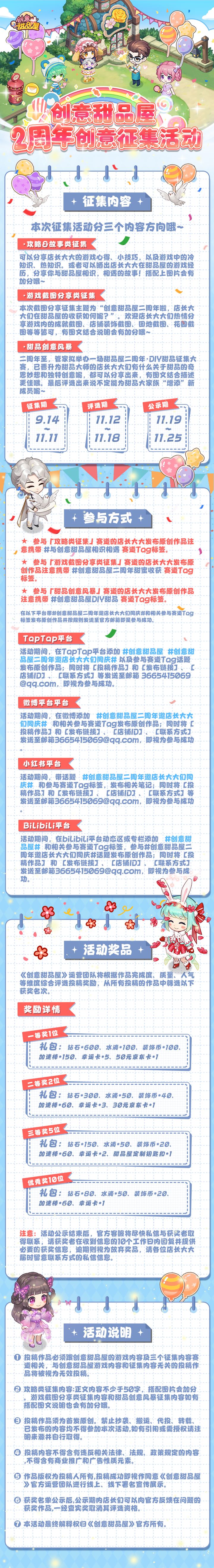 Bilibili平台:活动期间,在bilibili平台动态区或专栏添加#创意甜品屋# 和相关参与赛道Tag标签,参与#创意甜品屋二周年邀店长大大们同庆#话题发布原创作品;同时将【投稿作品】和【发布链接】、【店铺ID】、【联系方式】发送至邮箱3665415069@qq.com,即视为参与成功。