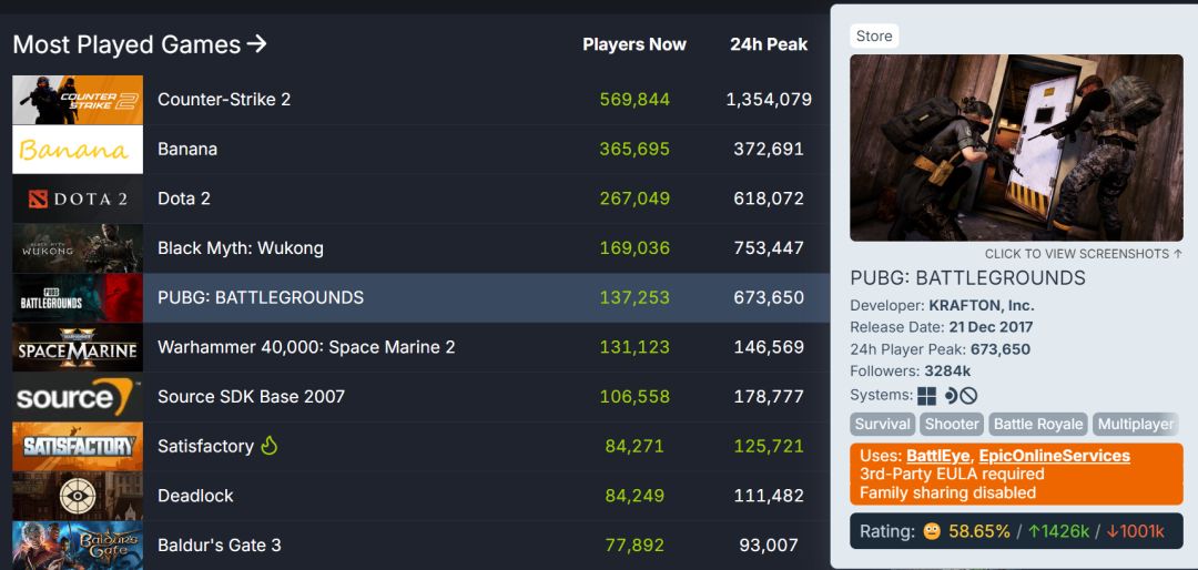 在2024年的PUBG可能不再是曾经那个风光无二的统治者,但瘦死的骆驼比马大——67W的日巅峰在线让它依然可以稳坐在steam排行榜前10。