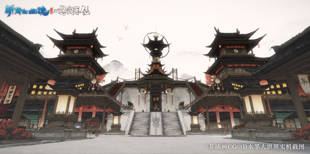 正德寺则侧重传统寺庙布局与诡异仙侠氛围的结合,沿袭传统寺庙中轴线布局,石阶、山门、大雄宝殿逐一呈现,营造出由外至内的静谧空间。