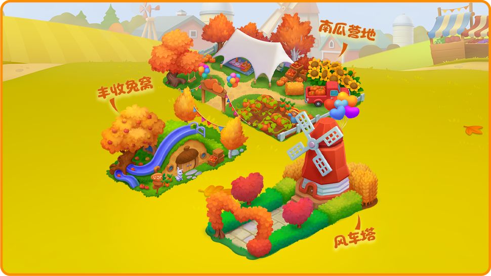 城镇即将迎来丰收佳节!在农田里可以看到一望无际的农作物、穿着背带裙忙碌的朋友们,来到南瓜营地和朋友们分享美味的樱桃蛋糕吧!让我们一起感受秋日丰收的快乐吧~