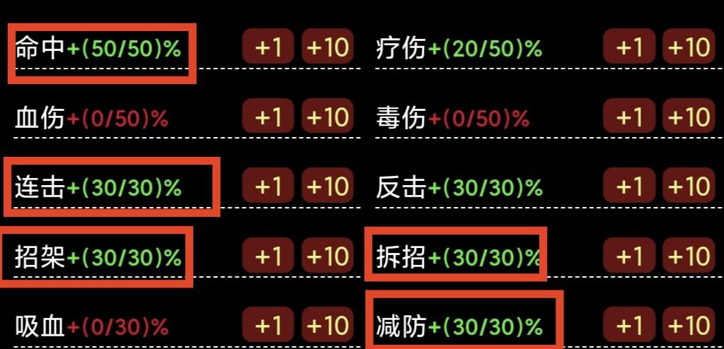 连击>命中>减防>招架>拆招>治疗>反击>攻击