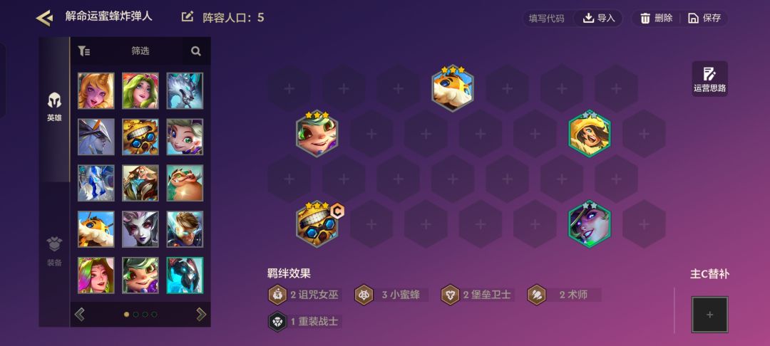 在原有的5小蜜蜂的基础上,我们舍弃掉了小法+大嘴,换上费用更低的蛇女+波比,组成5诅咒女巫(失去的150血有点不太够看,但是对付前期算是可以了)