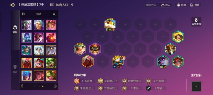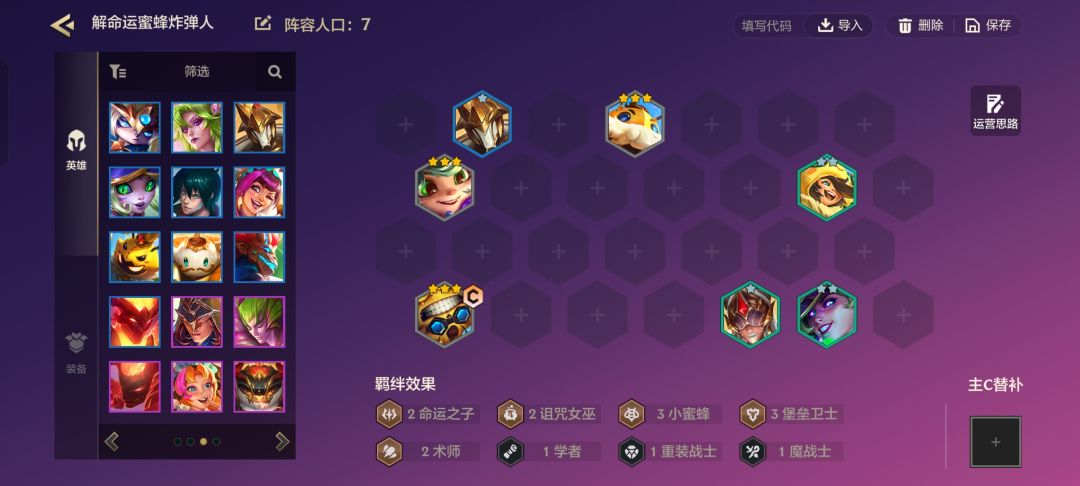 版本更新对小蜜蜂羁绊进行了一定程度的迭代,把蜜蜂数量、伤害计算和传递个数都换了一下。现在蜜蜂数量和传递个数固定了,提升羁绊层数提高的是伤害(7小蜜蜂甚至会以2倍的攻击频率攻击!)。因为小蜜蜂从3到5的提升相比于版更前更小了,所以我们舍弃5小蜜蜂,使用以启动换输出的2术士羁绊!