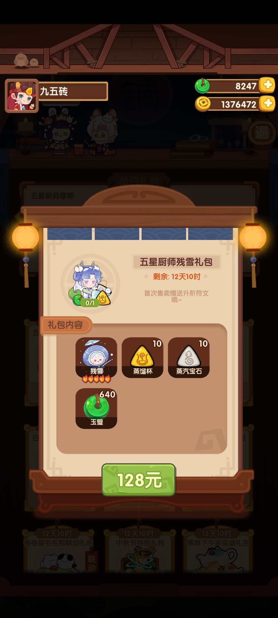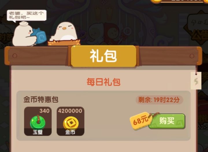 3,小氪萌新,这就是我的主场了,月卡氪完,你想前期玩的舒服,建议你再氪一个68的金币包(这个在每日的限时礼包里),有了这几百万的启动资金,就可以流畅起步了,采集,厨师能升满的直接拉满,新手金币池基本可以抽干。萌新如果想买限时厨礼包的话,本萌新的建议还是买那种自带符文的礼包,即战力,做菜直接上,风云宴厨神都好用。没符文的礼包对萌新来说升级太遥远了。限时厨礼包贵客,减时间和采集厨看个人喜好吧,你喜欢那种就买那种。