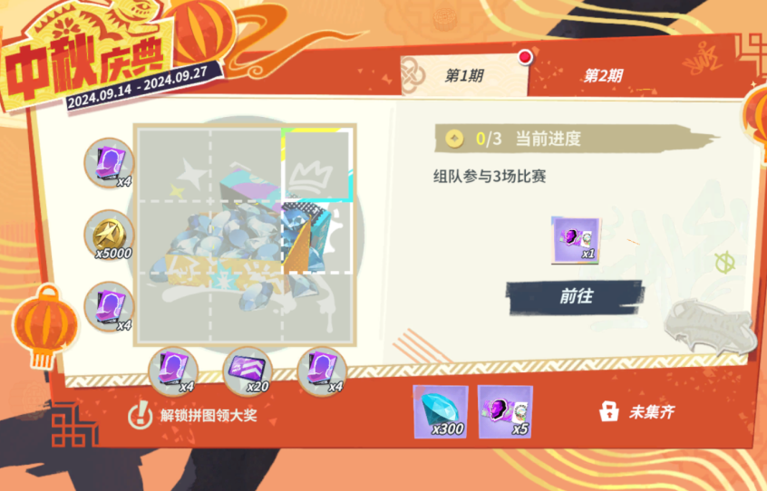 9月14日~9月27日,参与【中秋庆典】活动完成两期拼图任务,即可获得中秋限定头像“月明千里”、钻石、群星汇集券、明星天赋卡等奖励。