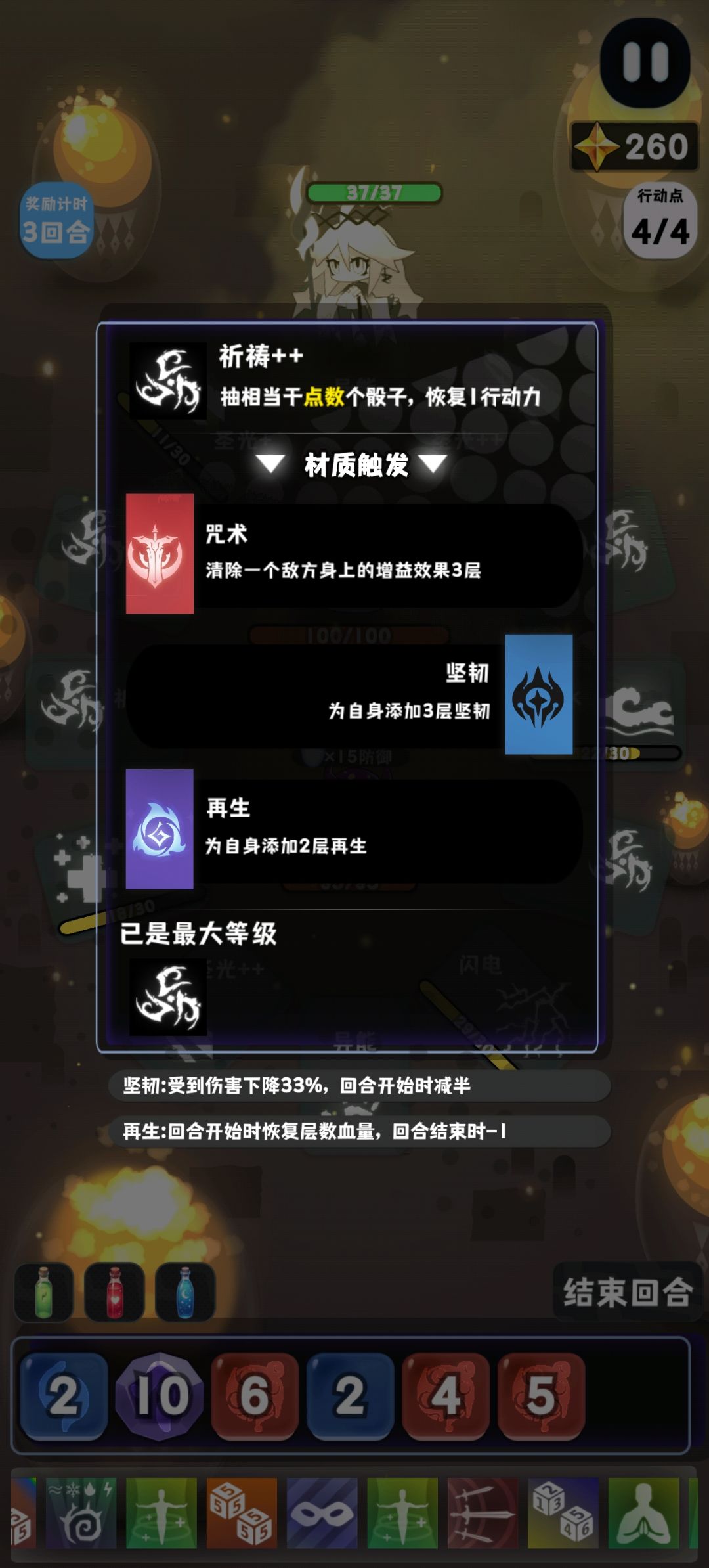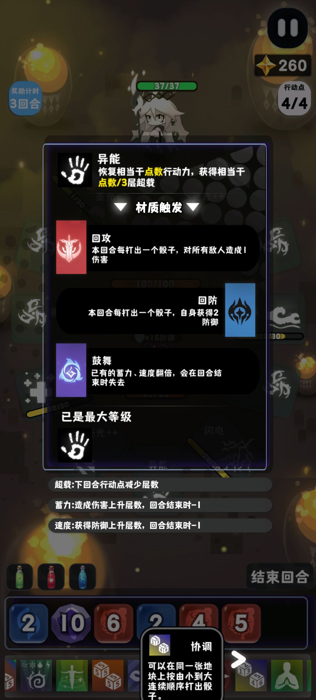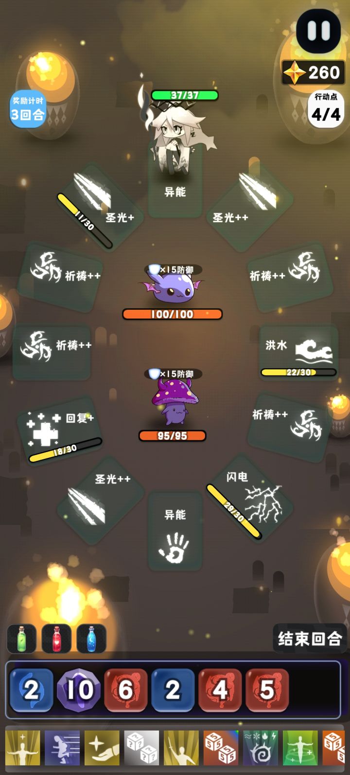 用的圣洁,技能有回响均衡协调,地块有祈祷和异能,异能加行动力,祈祷加骰子,加个圣光破机制怪,闭环了,1回合都能打死