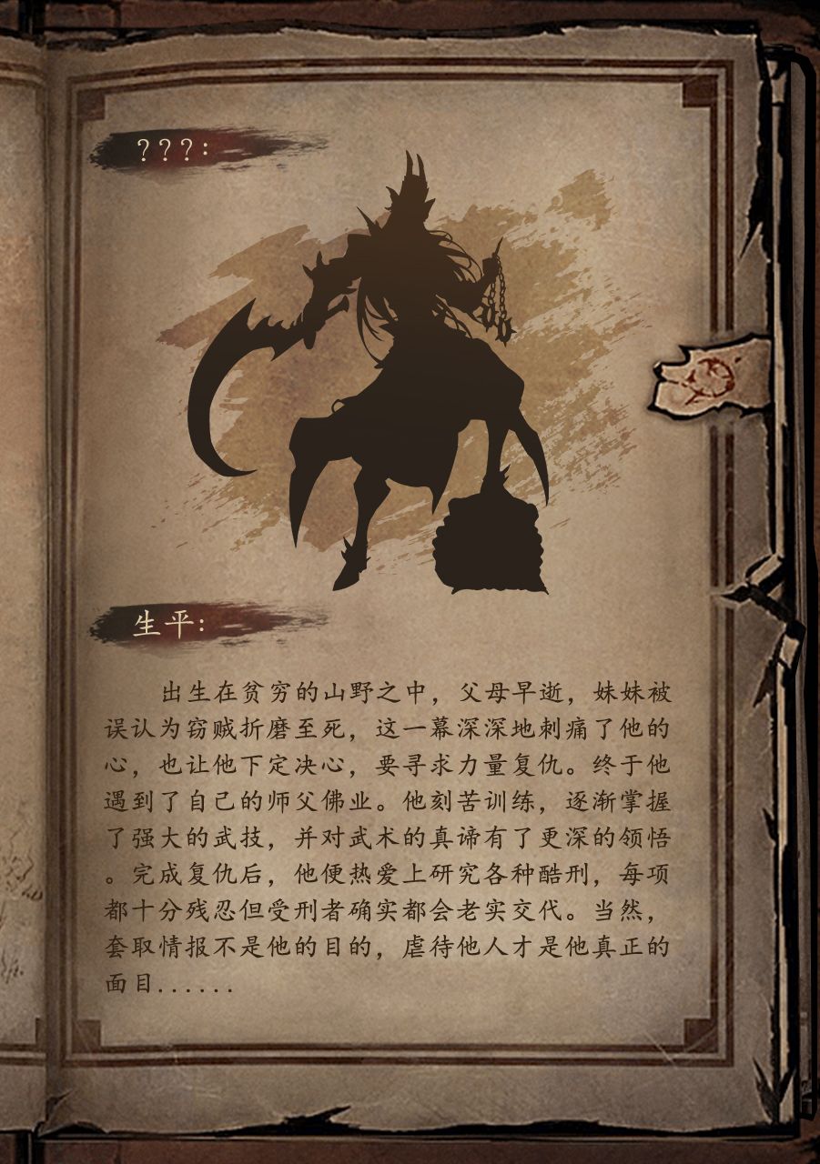 今日发现一位致力于研究各种恐怖刑具之人!据说他出生在贫穷的山野之中,父母早逝,妹妹被误认为窃贼折磨至死,这一幕深深地刺痛了他的心,也让他下定决心,要寻求力量复仇。终于他遇到了自己的师父佛业。他刻苦训练,逐渐掌握了强大的武技,并对武术的真谛有了更深的领悟。完成复仇后,他便热爱上研究各种酷刑,每项都十分残忍但受刑者确实都会老实交代。当然,套取情报不是他的目的,虐待他人才是他真正的面目......
