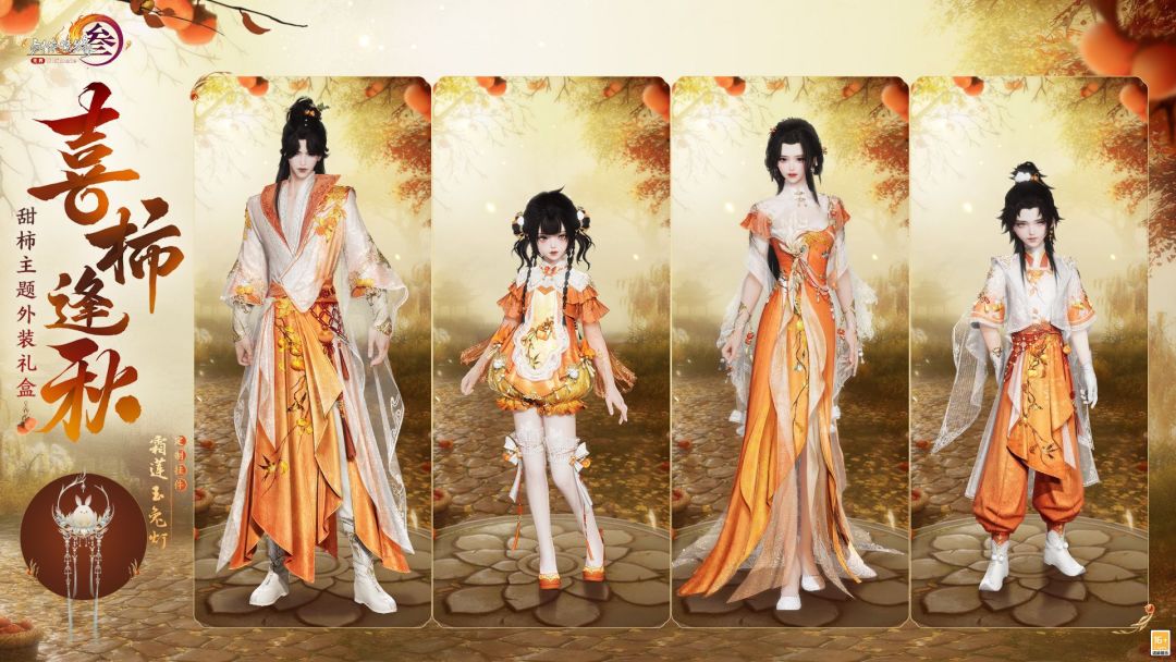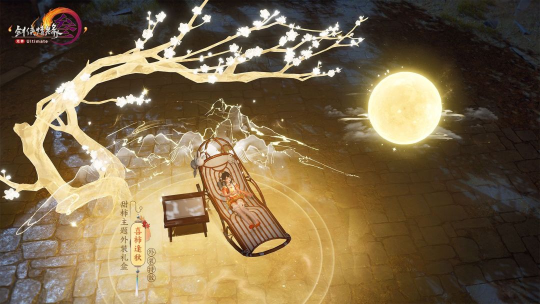 一套是以橙白两色为主的喜柿逢秋套装。橙白相间的外衣,洋溢着喜庆与活力,配上轻薄的柔纱,更为人物增添了几分灵动与飘逸。此外,这套装还附带中秋氛围浓厚的特效,为侠士营造一份独特的纳凉赏月风情。