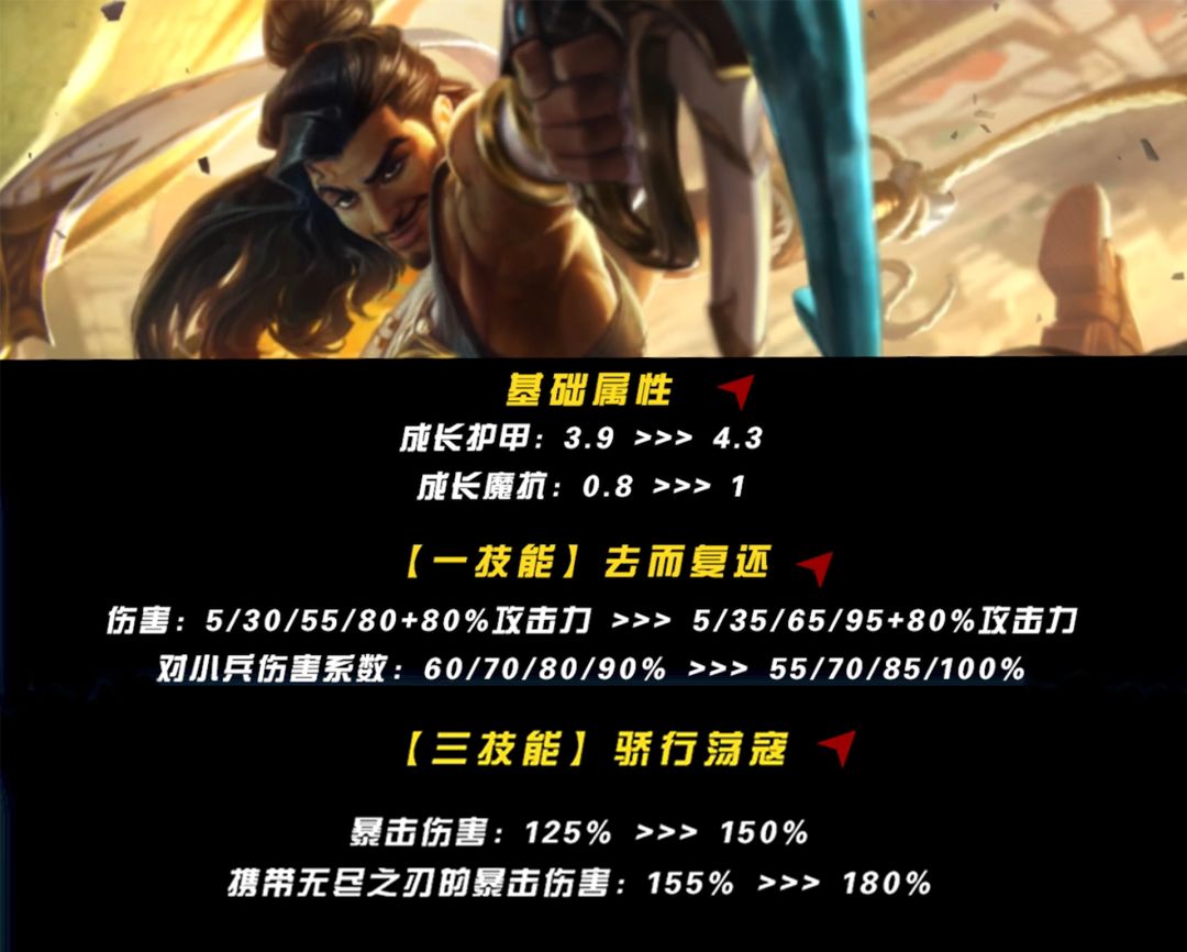 被动技能与Q(1)技能、R(4)技能的改动使他的伤害输出更为稳定,而W(2)技能和E(3)技能的调整则让他的连招操作更加流畅。现在他在野区的狩猎能力大幅提升,排名升至榜首。