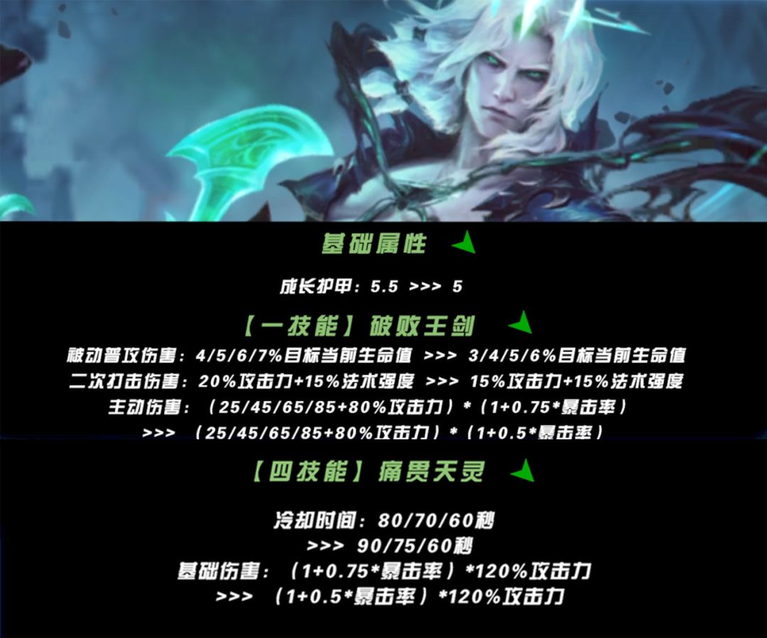 此外,本次更新中凯隐也获得加强,基础护甲的增加和能量获取效率的提高,加上在暗裔化身下Q(1)技能和R(4)技能的显著增强,使得凯隐在变身后能够更轻松地拿到战斗优势,排名有所提升。
