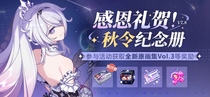 「感恩礼贺!秋令纪念册」活动开启!活动期间,舰长完成面板中的任务,可以获取商店代币「铭旅红叶」。使用「铭旅红叶」,可以在活动商店「漫秋拾旅」中兑换崩坏3原画集Vol.3《海与星的彼岸》、「秋叶红霜」自选箱、棱镜圣痕直升券等奖励!此外,根据兑换原画集的时间,还可获取至多3种活动勋章。