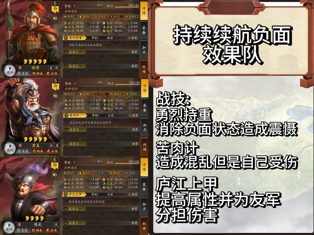 。所以自己受一点伤害能接受的,那么关键来了我们的陈武的技能就发挥效果了,因为黄盖的技能会让自己受伤那么如果敌人攻击的话会造成相当于两次的伤害,所以陈武的技能就是为了中和黄盖的伤害避免自己多受一次伤害这样。然后提高我们自己的属性将敌人击溃。