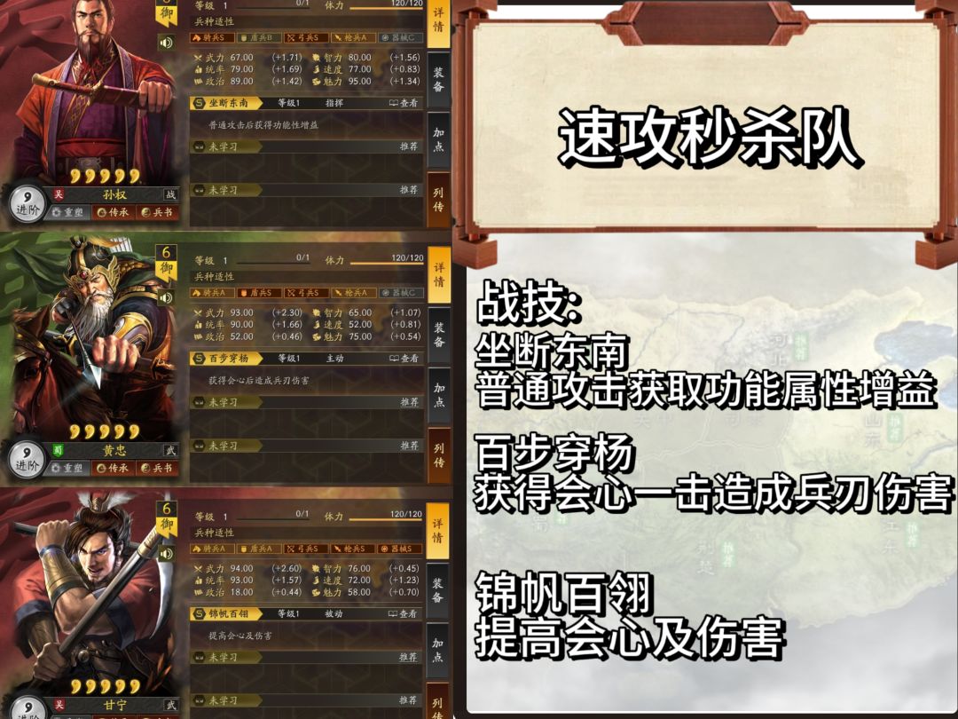 这个配队的思路是,虽然在游戏里面不可能有说一下秒杀的可能,但是这个配队的组和可以让你在获取资源和面对一些敌人的时候可以快速结束战斗,孙权的技能通过攻击可以提高武将的属性来让你黄忠和甘宁的战技达到非常恐怖的程度,也就是说,拖的越久伤害越恐怖,特别是参加时间比较久的战斗,作为后排稳定获取属性提升,让其他队伍替你扛一段时间,在拉出来是非常恐怖的,可以说是秒天秒地秒空气这样。而且前期也可以通过会心这个技能来给敌人造成懵逼的伤害这样。在运气之间你不需要进退两难这样。