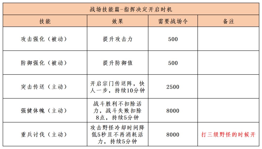 攻击强化和防御强化建议点满。突击传送可在3级野怪出现后开启,节省大量行动力,酌情开启重兵讨伐和强健体魄,重兵讨伐优先级更高。这样抢每次3级野怪的时候就没有冷却时间,也不消耗活力。每次3级野怪出现,高战力玩家都可以分一杯羹,建议中低战力玩家继续驻点即可。刀尸战场既可以抢野怪,也可以攻击玩家,如何决策制定战场策略,就看各位宗门管理的抉择了!