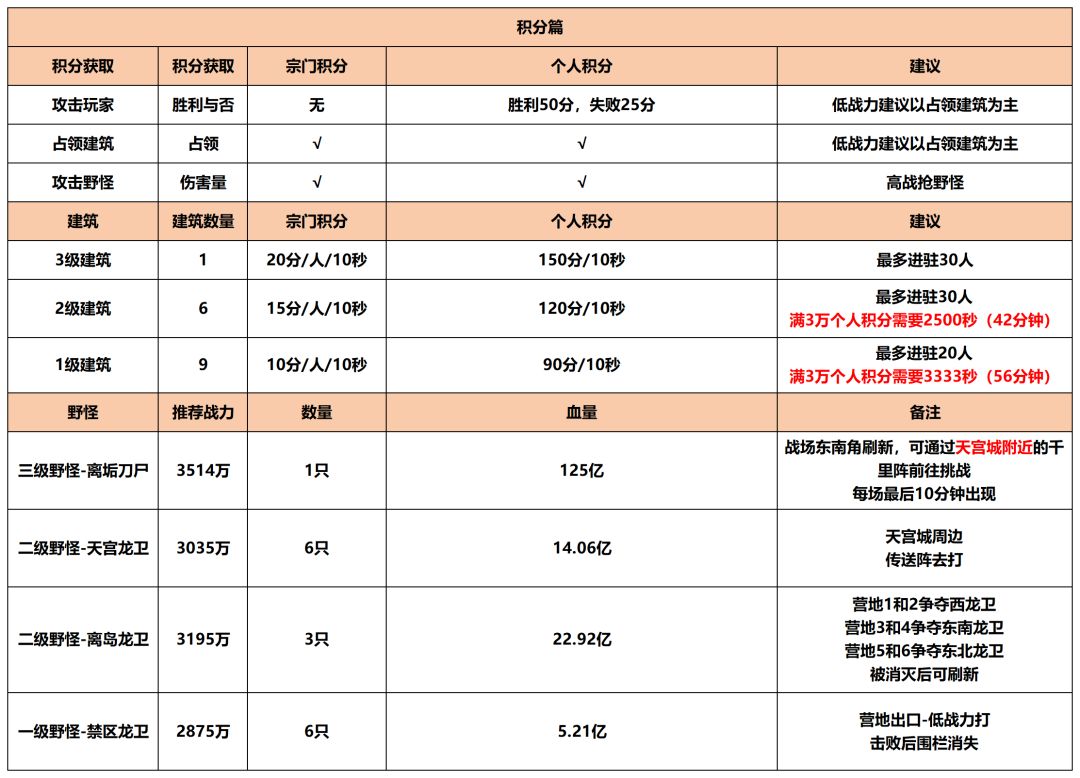 - 开局策略:开局前10分钟,抢野怪+抢3级建筑,围绕3级建筑做攻防;综合实力较差的宗门,可适当放弃,直接争夺2级建筑。