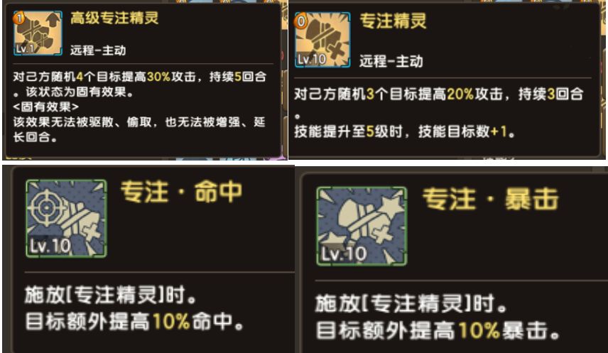 高级专注:对己方随机4个目标提高30%攻击,持续5回合。该状态为固有效果。<固有效果>该效果无法被驱散、偷取,也无法被增强、延长回合。