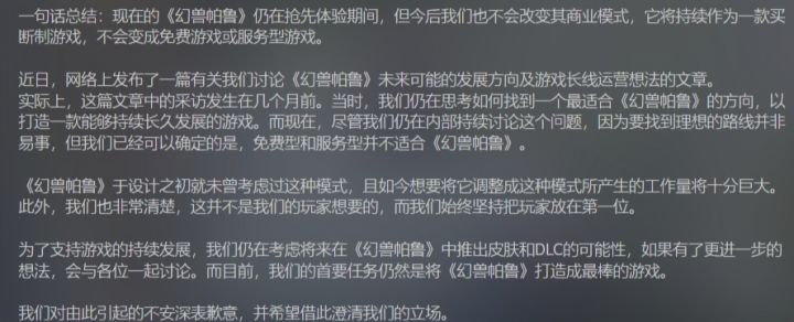 开发商回应,开发之初,他们没有考虑将《幻兽帕鲁》改为免费游戏。但会考虑出dlc和皮肤。一个测试中的游戏,不先把本体做好就想着圈钱出皮肤的行为,正意味着游戏转免的可能性存在。官方的这种回应,估计是因为想转免被玩家喷惨了才发的,没有作用。