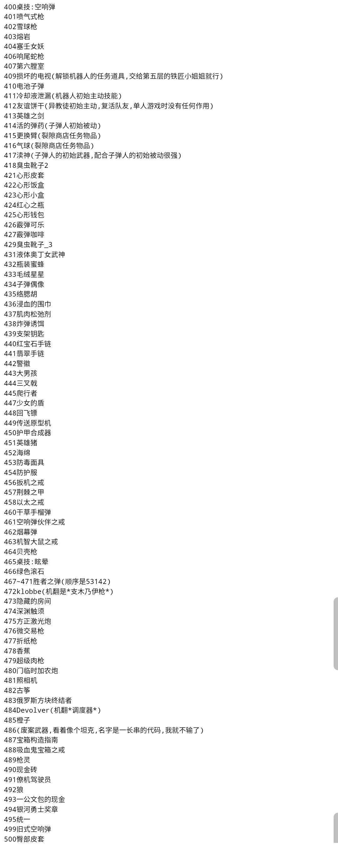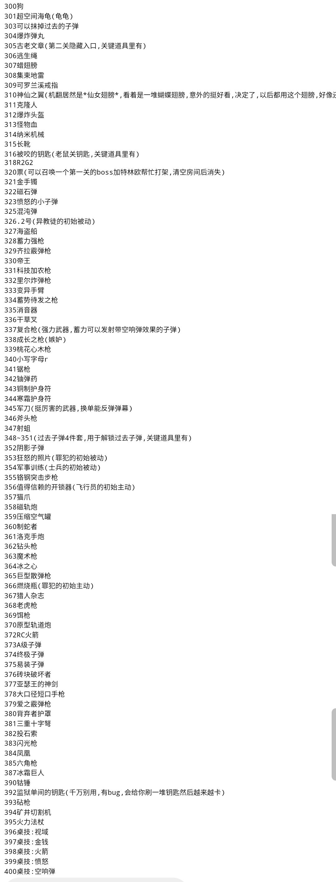 另外挺好用的几个:310 神秘之翼(效果是腊翅+翻滚轨迹留下魅惑敌人的液体,图鉴里没有的废案道具)