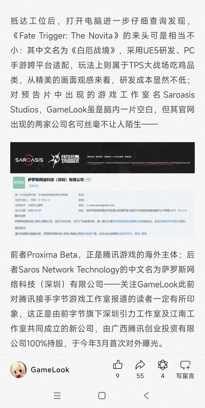 预告片中出现的游戏工作室名Saroasis Studios,其官网出现的两家公司名可丝毫不让人陌生——前者Proxima Beta,正是腾讯游戏的海外主体;后者Saros Network Technology的中文名为萨罗斯网络科技(深圳)有限公司——关注GameLook此前对腾讯接手字节游戏工作室报道的读者一定有所印象,这正是由前字节旗下深圳引力工作室及江南工作室共同成立的新公司,由广西腾讯创业投资有限公司100%持股,于今年3月首次对外曝光。彼时的报道称,江南工作室在研一款二次元开放世界项目(J5),而引力工作室在研一款二次元战术竞技项目(S1);毫无疑问,如今后者成为了今天的《白厄战境》。#今天游戏圈发生了啥