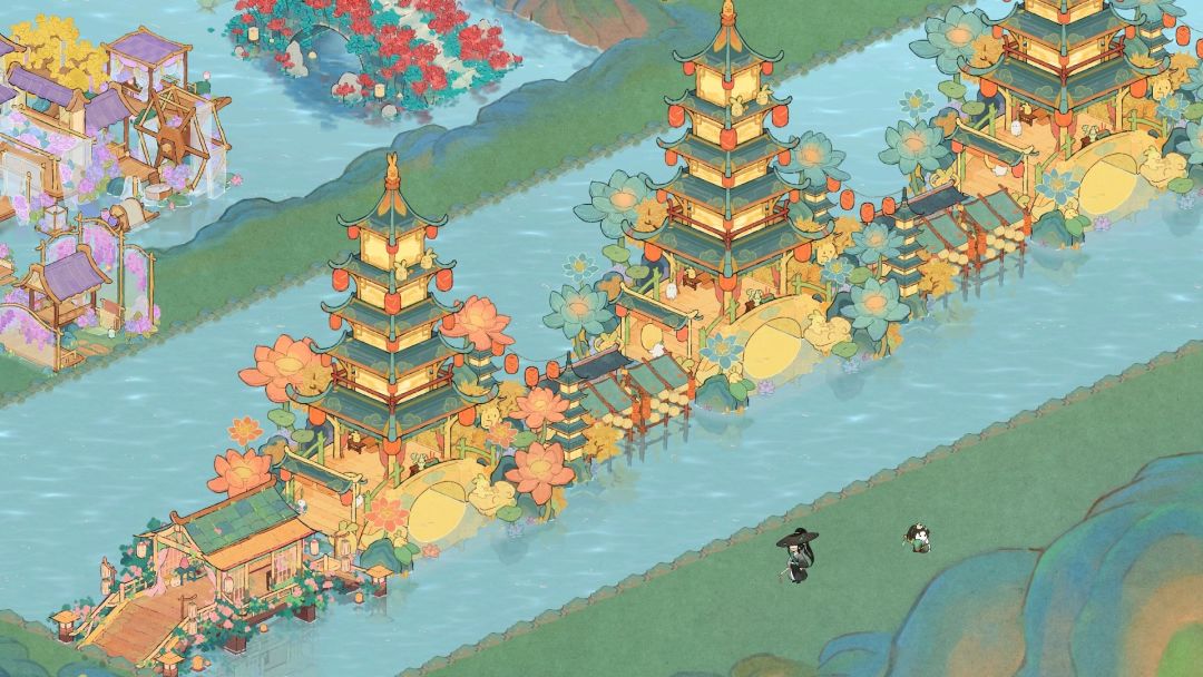 桥的两端尝试了两种方法,桃源乡的甲桥正好适配,另一种是用乙级廊桥制造一个弯曲,两种效果都还不错