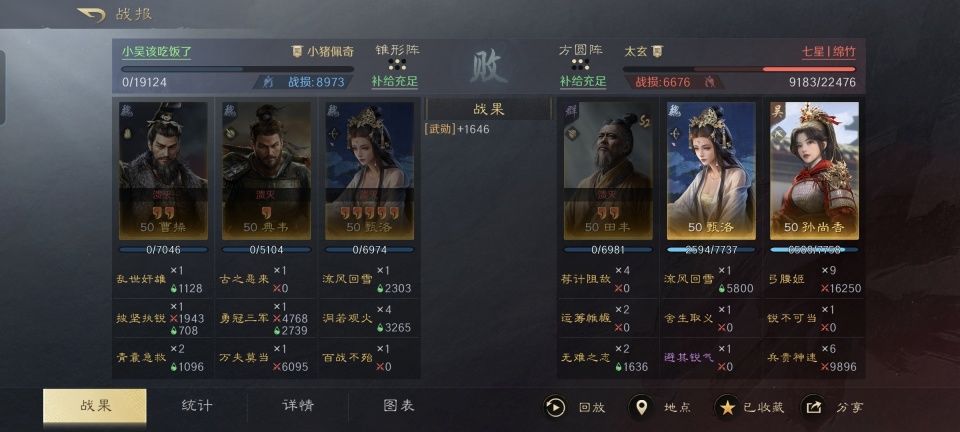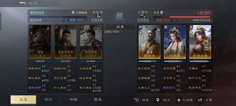 在这里要特别鸣谢游戏ID名为“七星丨绵竹”的玩家朋友,为本文提供了宝贵的创作素材。他分享的战报总共是三场,我就捡最具代表性的一场来详细讲。七星丨绵竹利用麾下的田丰、甄洛和孙尚香摆出方圆阵,前排是田丰和甄洛一起扛伤,后排必须是孙尚香吃连击的加成。仅仅用时四个回合,对面的双减关羽就被淘汰出局,详细的思路且看下文分解。