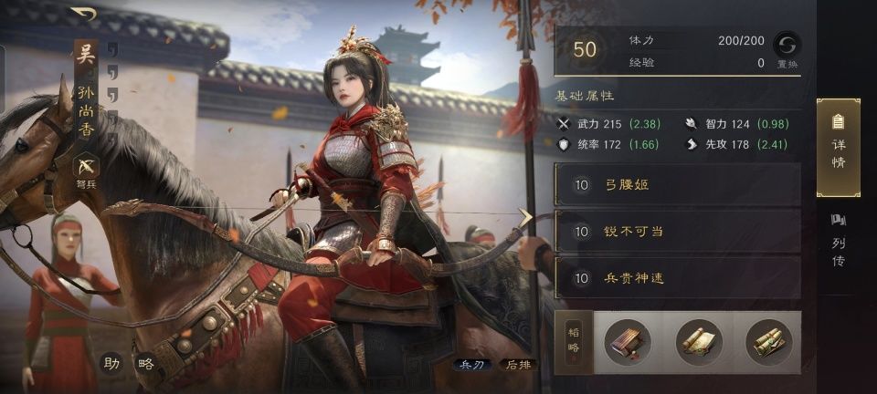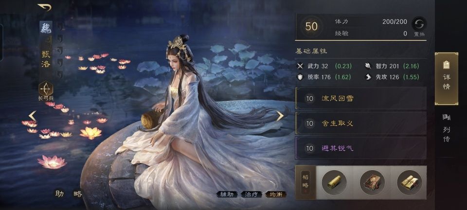 甄洛战法:流风回雪+舍生取义+避其锐气。韬略库:备战残章+洛神赋下卷(专属)+临峰善本。长弓兵特性洞悉,专精点亮袍泽同心。通过专属金书洛神赋下卷,把洛神状态稳稳套在了孙尚香的头上。接下来要做的,就是扛伤和加连击,一切为了力捧孙尚香。