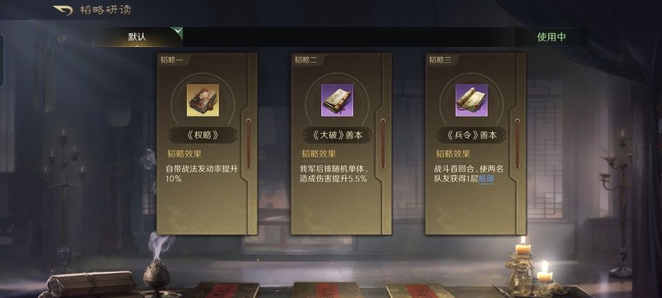 田丰战法:荐计阻敌+运筹帷幄+无难之志。韬略库:权略(专属)+大破善本+兵令善本。剑盾兵特性专注,专精点亮步步为营。利用装备和坐骑的加成,让孙尚香的统率值超过甄洛,就可以吃到田丰荐计阻敌的增益效果了。对面统率值最低的邓艾,则遭到了荐计阻敌的强力压制,他的智力和先攻被降下来,就会严重干扰到治疗的效率。