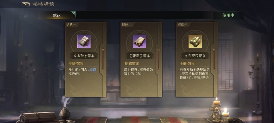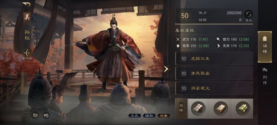 孙权战法:虎踞江东+清风驱疾+洞若观火。韬略库:金鼓善本+兼资善本+东汉观记(专属)。长弓兵特性洞悉,专精点亮袍泽同心。身处在锥形阵后排的孙权,自然是要以辅助为核心。清风驱疾和洞若观火既能提供治疗和清醒,更是可以配合着虎踞江东,提升全队主动战法14%的发动率,这点最为关键!