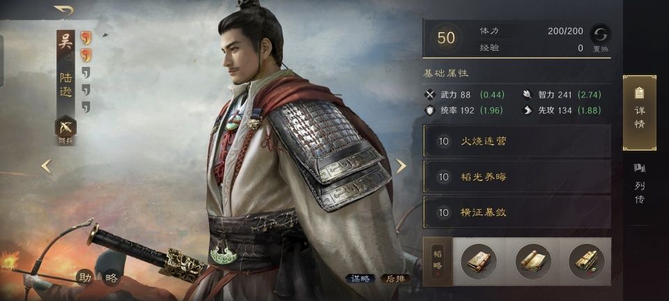 陆逊战法:火烧连营+韬光养晦+横征暴敛。韬略库:料敌善本+夺计善本+焚粮(专属)。弩兵特性劲弩,专精点亮釜底抽薪。韬光养晦加上孙权的虎踞江东,陆逊火烧连营的发动率达到了80%,小乔的预热足够他以火力主宰战场了。而且金书焚粮还能让陆逊在前期严重削弱对方的治疗效果,这对于敌人而言也是致命的。