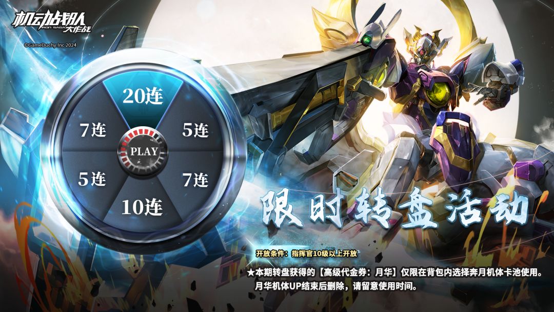 限时登录转盘活动将在下周更新后同步开启,活动期间连续登录游戏,即可参与机体转盘活动。本次转盘活动持续3日,转盘获得的【高级代金券:月华】绑定「月华」机体卡池,仅限活动期间使用~
