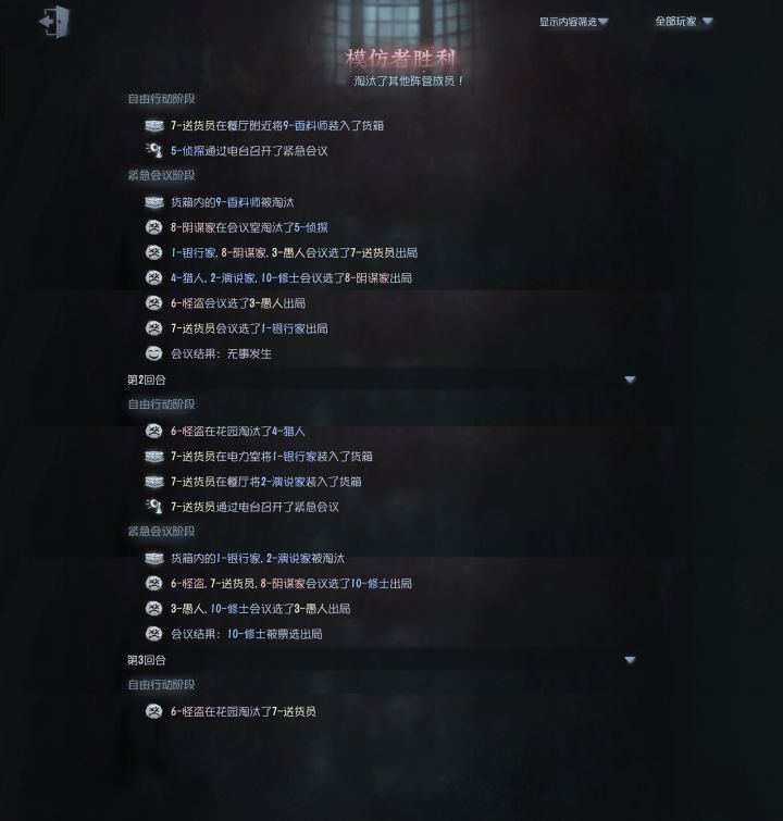 我是货拉拉哈,开局随处散步,被人视奸了,我能受这个气,我直接把他给吃了,结果被人看见了,同时侦探把狼给验出来了,去报的警,结果愚人跳侦探,侦探投票环节又被发毕业证了。因为这局票数分散,我活下来了,愚人自爆,我顺手收了两个,其中一个还感谢我,因为侦探一个也没票出去。最后修士心死般的投了愚人一票。最后没成功吃了愚人,就和狼拼刀,结果输了,感觉送货员的优先级更低些