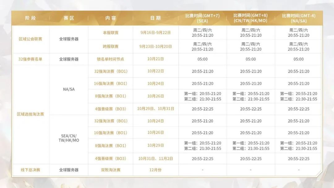 1. 地区选拔赛前2名的公会将获得参与线下总决赛的资格,参赛公会的会长与历史战力最高的前9名玩家,将组成公会代表队进行线下比赛;