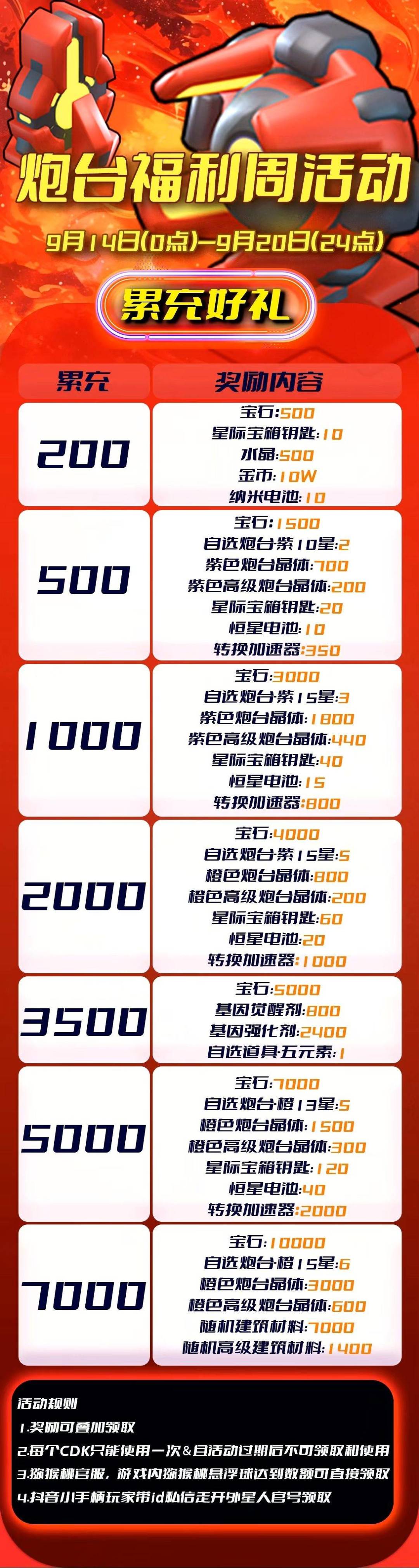 炮台福利周累充活动!