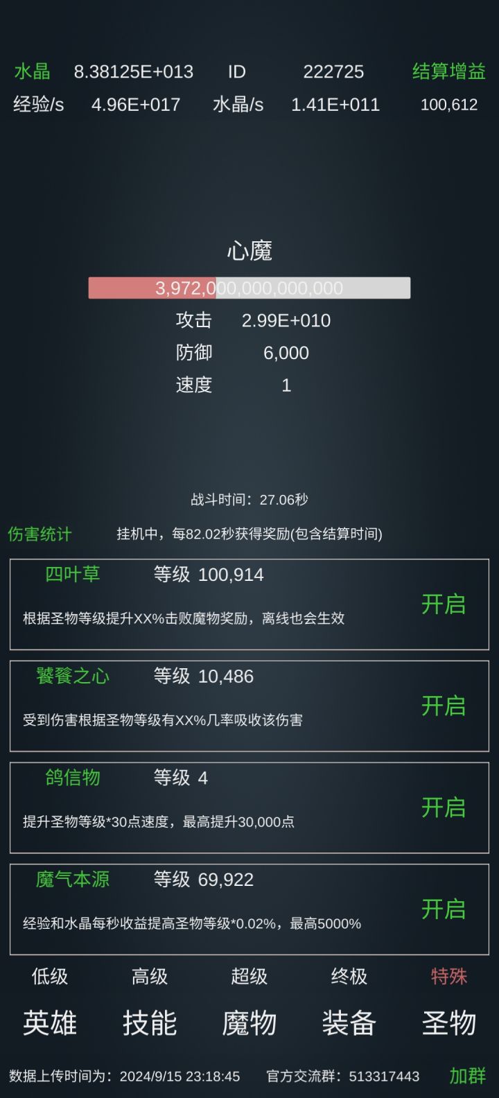 这个等级完全溢出,邪虎过后补了31w贤者之石、71w霸者之道、23w医者之心这些都没管用,饕餮从100补到1w直接过了(单次16秒)。所以300亿级左右想过的先把饕餮刷满再补前面提到的圣物,弯路我已经帮你们走了