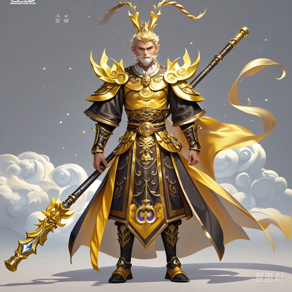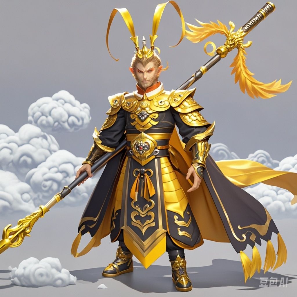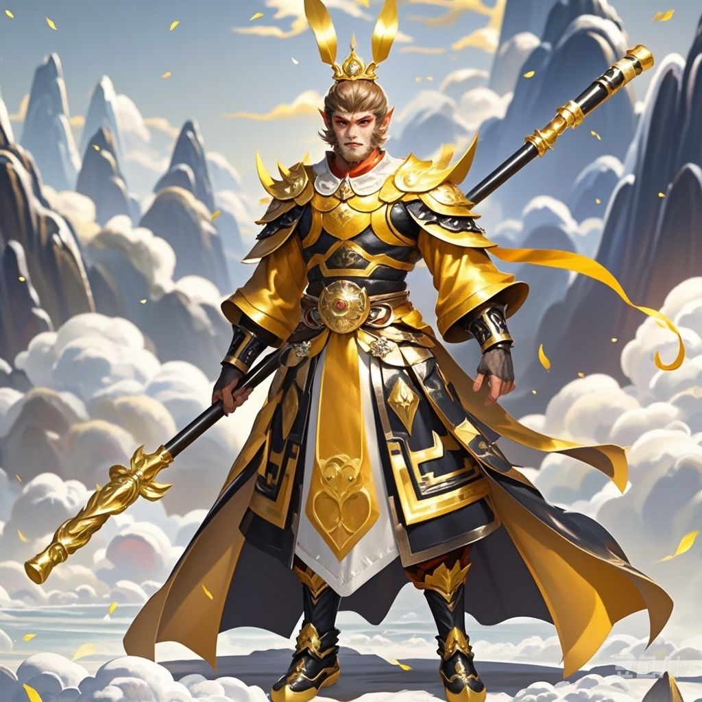 主色调采用耀眼的金色与沉稳的黑色相间,模拟孙悟空身披锁子黄金甲的英姿。战袍上绣有细腻的龙鳞图案,在光影交错间若隐若现,如同云雾缭绕中的真龙天子。衣摆随风轻扬,仿佛携带了九天之上的仙气,每一步都踏出凌云之志。