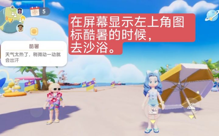 在屏幕显示左上角图标酷暑的时候,去沙浴。