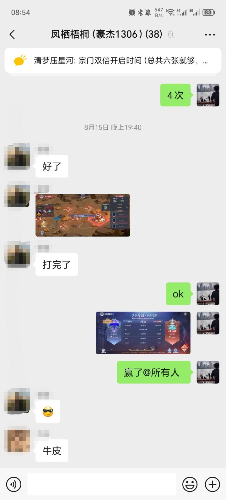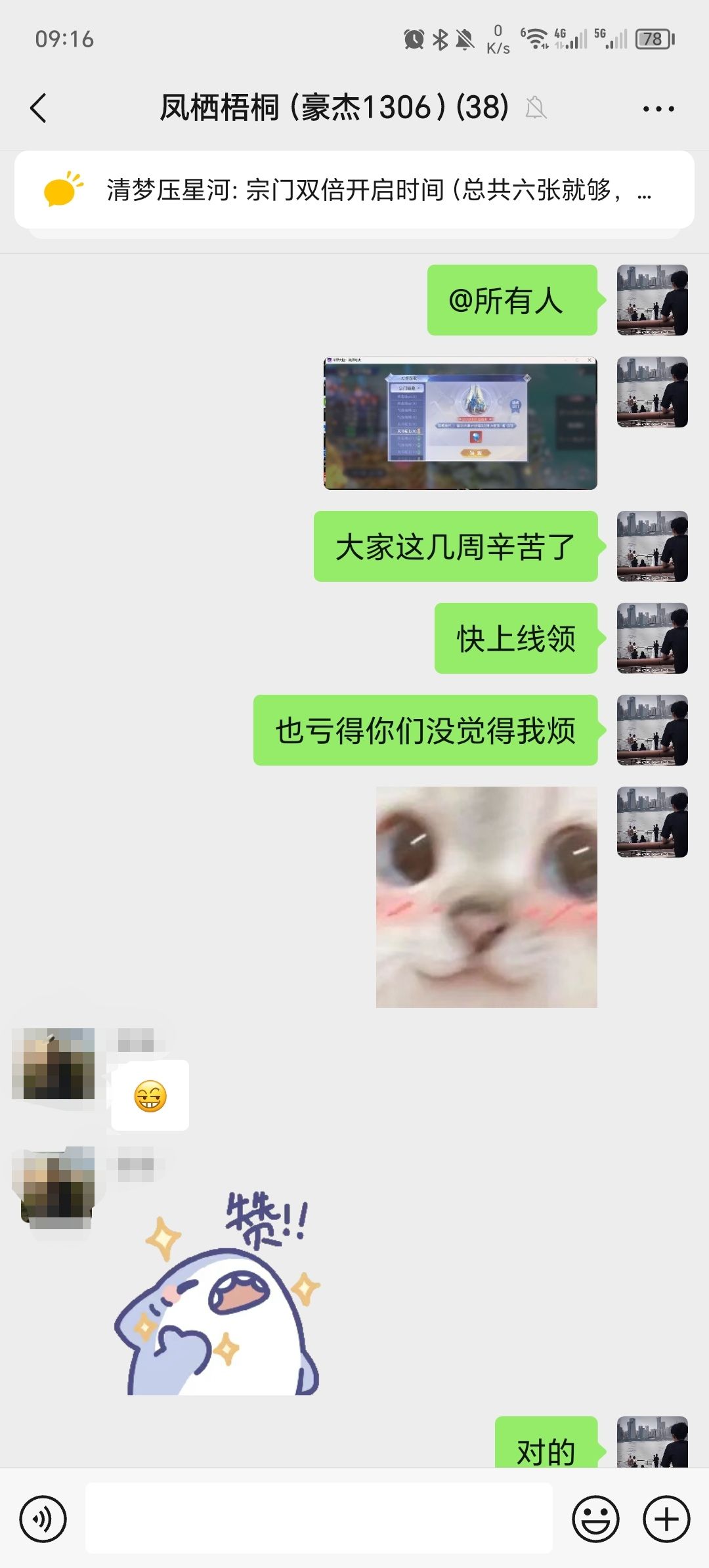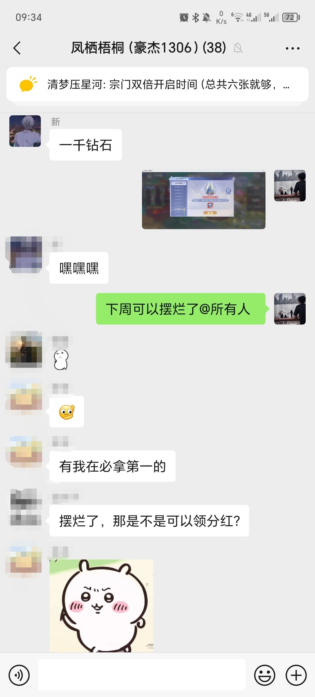 还有第一次宗门选拔赛,铺天盖地的@所有人,相差过大的战力,都没有让我们退缩,经过三周高强度的活动参与度,我们最终获得了上宗门赛第六。高达4w的钻石,让我们喜笑颜开,觉得一切都值得。