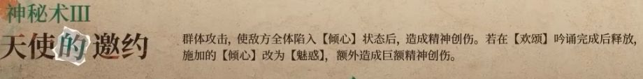 而天使的邀约是天使娜娜的神秘术三,很有可能也是算一张阶次咒语的(参考露西神秘术三动能守恒,看截图最后一张),就是不知道算一阶咒语还是二阶咒语,理论上可能会是一阶,毕竟娜娜定位是副c。