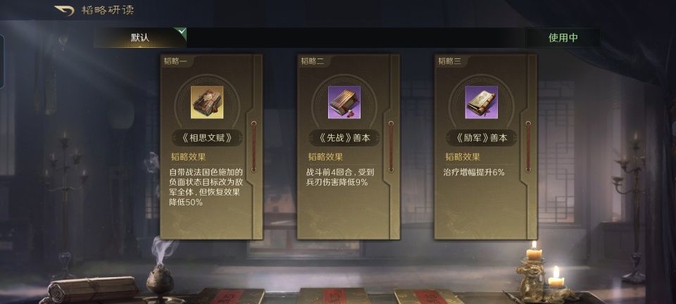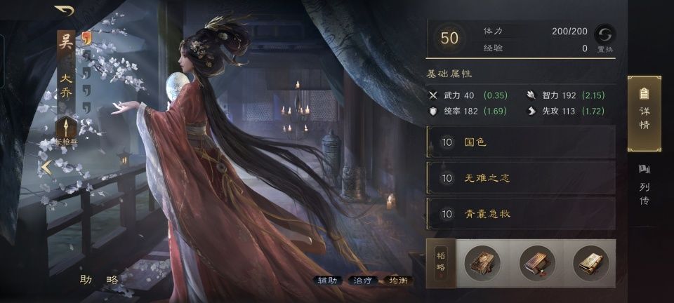 大乔战法:国色+无难之志+倾囊急救。韬略库:相思文赋(专属)+先战善本+励军善本。长枪兵特性破敌,专精点亮愈战愈勇。