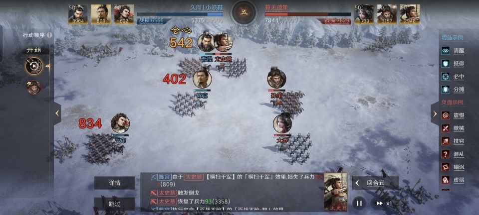太史慈战法:弦无虚发+三军夺气+横扫千军。韬略库:蓄力(专属)+得势善本+敌腹善本。身处方圆阵后排的太史慈,因为阵型加持和大乔的铺垫,总的连击率达到了85%。如此就能高频率的触发夺气,大幅削减对手的武力、智力和统率。凭借着专属金书的增益效果,偶数回合的太史慈,追击战法三军夺气和横扫千军的发动率会被分别提升到70%和60%。