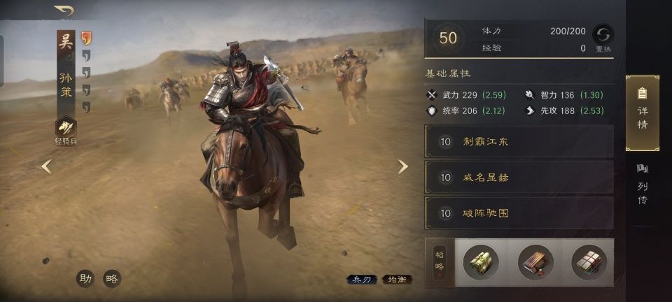 孙策战法:制霸江东+威名显赫+破阵驰围。韬略库:霸王传(专属)+强战善本+兵道善本。轻骑兵特性疾驰,专精点亮乘胜追击。为了最大限度的发扬太史慈的连击优势,故而此番列出了方圆阵。大乔和孙策两口子都位于方圆阵的前排,获得了5%的减伤保护。大乔主要负责的是治疗和驱散,还通过无难之志给孙策和太史慈提升了45%的连击和20%的倒戈。孙策则是输出和治疗并重,因为身处前排,制霸江东的治疗系数得以提升30%,威名显赫在大乔的加持下,倒戈率提升到了50%。