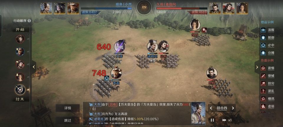 孙权战法:虎踞江东+无难之志+倾囊急救。韬略库:先勇善本+东观汉记(专属)+励心善本。长弓兵特性洞悉,专精点亮远攻近守。此战摆出的是锥形阵,孙权和邹婶娘两人在后排。无难之志和倾囊急救都是主动战法,所以激活了虎踞江东给全体提升14%主动战法发动率的属性。