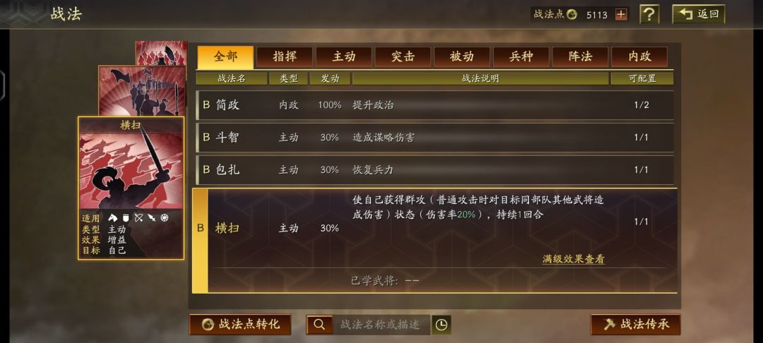 战法:一共分为S、A、B三档品质,其中品质越高,升级所需要的战法点越多,前期战法最多升到5级即可,后面消耗的战法点会越来越多
