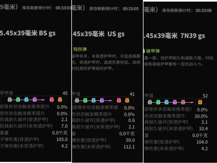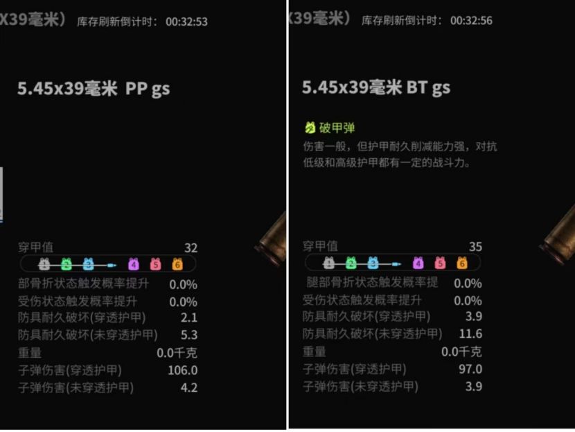 其次推荐五级的穿透弹,根据爆头系数(4.2倍)和任务最大生命值(425)可知,5级穿透弹的穿透伤害(104.0)是可以一枪击败敌方的。同时,10.4的防具耐久破坏在面对六套也有一定的博弈空间,还是很推荐喜欢精准打击的萤火虫们上手这款子弹的。