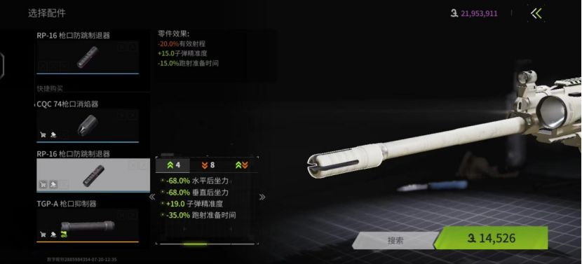 核心配件: 枪口——指定RP-16枪口防跳制退器,虽然该枪口会减少有效射程,但是“-15%跑射准备时间”和“+15子弹精准度”在近距离交火时能够更快更准的将火力倾斜到对方身上,也可以依靠短的跑射时间拉扯、消耗对面,从而在对枪中获得胜利。