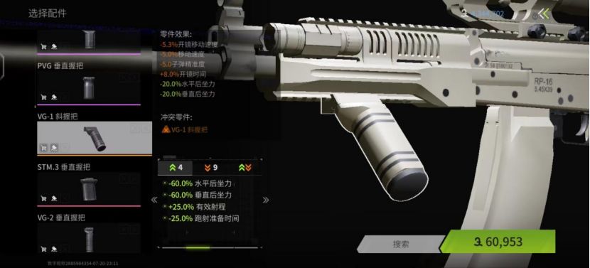 前握把——推荐VG-1斜握把,下位替代有CTE三角握把(加子弹精度)、STE.3垂直握把(减少后坐力)和PVG垂直握把(提升开镜射击体验)等。